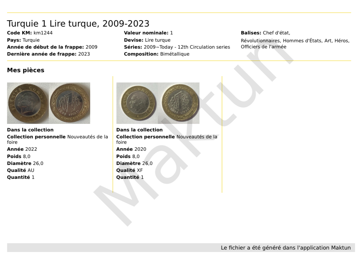 Exportez les données de votre collection dans des formats pratiques tels que PDF, XLS ou CSV. Vous pouvez sauvegarder vos informations précieuses sur les pièces et les billets sur votre appareil ou envoyez-les par e-mail.